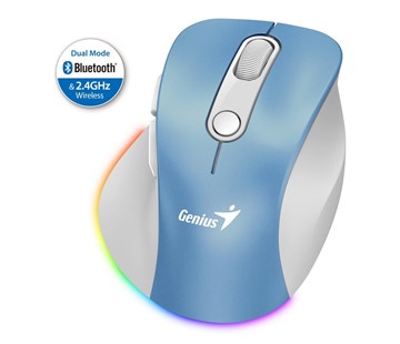 Myš, bezdrátová, optická, 2400DPI, 6 tlačítek, Bluetooth, 2,4GHz, USB-C nabíjení, tichá, 7barevné podsvícení, modro-bílá