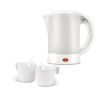 | Rozměry jsou malé, ale unikátní konstrukce zaručuje vynikající kapacitu 0,6 litru a díky dvěma šálkům, které jsou součástí balení, je ideální pro malé rodiny a pro použití nejen na cestách. Celkový výkon činí 650 W, díky čemuž na svůj nápoj nebudete muset čekat o moc déle než u klasické konvice. O provozu konvice informuje světelná kontrolka a po dosažení bodu varu se konvice sama vypne. Samozřejmostí je také bezpečnostní ochrana proti přehřátí. |  |