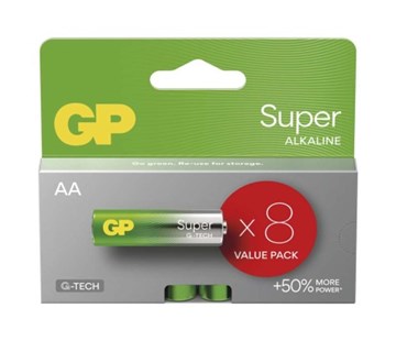 chemické složení: alkalické|hmotnost: 23 g|kapacita: neuvádí se|kategorie/řada: Super Alkaline|max. skladovatelnost: 10 let|možnost nabíjení: ne|napětí: 1,5 V|počet nabíjecích cyklů: nenabíjecí|prodejní obal: 8 ks, papírová krabička|provozní teplota: -18 °C až +50 °C|rozměr: 14,5 × 50,5 mm|typ: LR6 (tužka, AA)|velikost baterie: AA|značka: GP