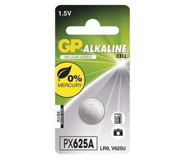chemické složení alkalické, kategorie/řada Alkaline cell, typ GP PX625A (LR9, V625U), napětí 1,5 V, možnost nabíjení ne, kapacita 190 mAh (při zátěži 600 Ohm), rozměr 15,6 × 5,95 mm, hmotnost 2,9 g, provozní teplota 0 °C až +45 °C, max. skladovatelnost 3 roky,záruční doba 2 roky