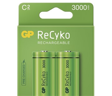 chemické složení: NiMH, značka: GP, kategorie/řada: ReCyko, typ: HR14 (malé mono, C), velikost baterie: C, napětí: 1,2 V, možnost nabíjení, kapacita: 3 000 mAh, počet nabíjecích cyklů: více než 1 000, rozměr: 26,2 × 50,0 mm, hmotnost: 70 g, provozní teplota: -20 °C až +50 °C