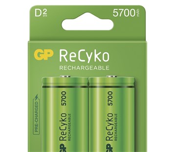 chemické složení: NiMH, značka: GP, kategorie/řada: ReCyko, typ: HR20 (velké mono, D), velikost baterie: D, napětí: 1,2 V, možnost nabíjení, kapacita: 5 700 mAh, počet nabíjecích cyklů: více než 1 000, rozměr: 34,2 × 61,5 mm, hmotnost: 155 g, provozní teplota: -20 °C až +50 °C