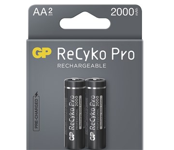 chemické složení: NiMH, značka: GP, kategorie/řada: ReCyko Pro, typ: HR6 (tužka, AA), velikost baterie: AA, napětí: 1,2 V, možnost nabíjení, kapacita: 2 000 mAh, počet nabíjecích cyklů: více než 1 500, rozměr: 14,5 × 50,5 mm, hmotnost: 30 g, provozní teplota: -20 °C až +50 °C,