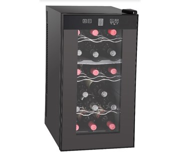 vinotéka/chladicí vitrína • energetická třída C • kapacita 18 lahví • hlučnost 33 dB • duální zóna chlazení • nastavitelná teplota 8 až 18 °C a 12 až 18 °C • termoelektrický chladicí systém bez kompresoru a vibrací • průhledná dvířka z temperovaného skla • hladká zadní stěna • displej • modré LED osvětlení • 64,5×34,5×50,8 cm