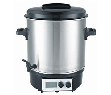 zavařovací hrnec • objem 27 l • příkon 1800 W • pojme 14 až 18 zavařovacích sklenic • časovač do 120 minut • funkce nepřetržitého provozu • ochrana proti přehřátí • termostat od 30 do 100 °C • tepelně izolované rukojeti • LCD displej • otočné ovládání • také pro přípravu svařeného vína, guláše, polévek, tavení vosku • hmotnost 6,1 kg