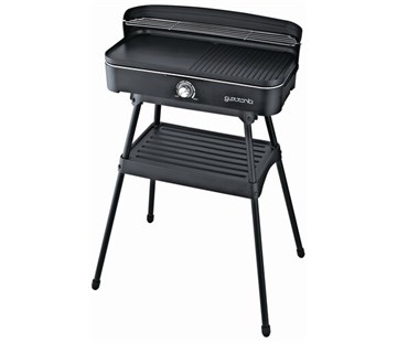 elektrický gril • příkon 2200 W • žebrovaná grilovací plocha s nepřilnavým povrchem (50 × 25 cm) • vyjímatelná deska pro snadné čištění s integrovaným odtokem přebytečného tuku • nadbytečný tuk odtéká do samostatné nádoby • plynulá regulace teploty s otočným ovladačem • stabilní snadno odnímatelný stojan s poličkou • rozměry 87 × 52 × 26,5 cm