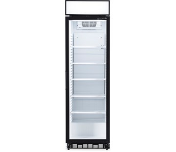 chladicí vitrína • energetická třída D • objem 346 l • 5 výškově nastavitelných polic • ventilované chlazení • dvojité temperované sklo dveří • eko chladivo R 600a bez CFC • nastavitelný termostat • rozsah chlazení od +1 °C do +9 °C • vnitřní LED osvětlení • reklamní plocha na prosvětlovacím boxu • 2 kolečka a 2 výškově nastavitelné nožičky • hlučnost 46 dB • 199×59,5×60 cm • hmotnost 80 kg