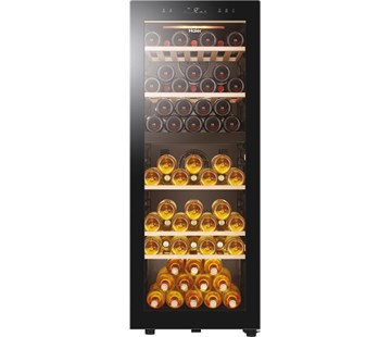 vinotéka • energetická třída G • objem 190 l • kapacita 79 lahví • hlučnost 37 dB • nastavitelná teplota 5 až -20 °C • displej • LED osvětlení • systém Natural Airflow • antivibrační kompresor • technologie přirozeného proudění vzduchu • dřevěné police • 127×49,7×58,5 cm