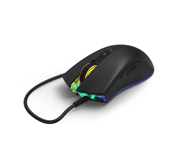 | Myš určenou pro pravou ruku připojíte k počítači pomocí kvalitního opleteného USB kabelu s délkou 1,8 metru. Pak si můžete vychutnat nejenom rychlý a přesný pohyb 160 gramů lehkého těla myši, ale i jejich 8 tlačítek, se kterými pohodlně obsloužíte všechny různé herní funkce a nabídky. U herní myši samozřejmě nemůže chybět stylové RGB osvětlení, které dotvoří skvělý dojem z jejího používání. |  |
