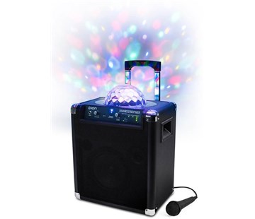 bezdrátový reproduktor • Bluetooth • integrovaná dobíjecí baterie s výdrží až 75 hodin • dvoupásmové reproduktory s výkonem 50 W • echo efekt • světelné efekty (3 režimy projekce na stěny a strop) • AUX (3,5mm jack konektor) • možnost připojení mikrofonu (mikrofon je součástí balení) • kompatibilní se zařízeními iPad, iPhone, iPod, Android a Windows Phone • možnost ovládání mobilní aplikací • kolečka a teleskopická rukojeť • rozměry 292×381×546 mm • hmotnost 11,8 kg
