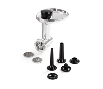 Mlýnek na maso pro roboty Kenwood Chef XL Sense a kMix; 3 kovové protlačovací disky; kovový plnicí tác; plastový klíč pro demontáž; vhodný na mletí masa, ryb či zeleniny; nástavce na výrobu domácích klobás a kebbe