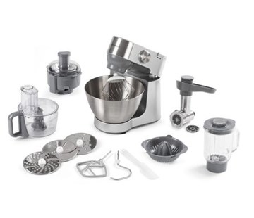 kuchyňský robot • příkon 900 W • 4,3l pracovní mísa • 6 stupňů rychlosti • vhodný pro šlehání, míchání, hnětení, mixování, mletí, sekání, strouhání, lisování citrusů, odšťavňování • planetární míchání • bohaté příslušentví • kompaktní rozměry • příslušenství - šlehací metla, míchací metla, hnětací hák, 1,2l mixér, food processor, mlýnek na maso, lis na citrusy, odšťavňovač, 3 strouhací disky, nalévací štít na mísu • hmotnost 4,5 kg