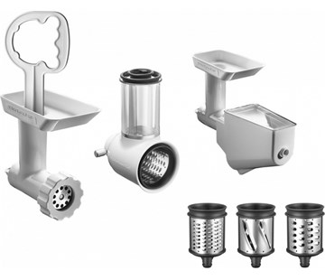 Balíček s příslušenstvím obsahuje mlýnek na maso, lis na ovoce a zeleninu, krouhací nástavec