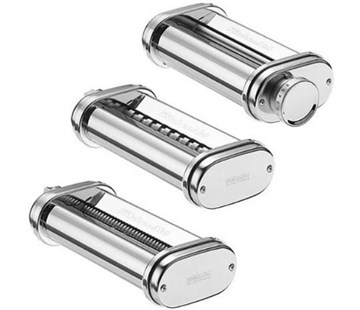 Příslušenství k robotům Kitchenaid. 3ks nástavců, se kterými je možné vyrobit 140mm široké pláty na lasagne, široké nudle a tenké nudle. Válečky z řezacími noži jsou vyrobeny z masivního pochromovaného kovu a jsou dodávány s kartáčem na čištění.