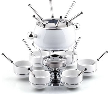 "Sada na fondue v efektní bílé barvě, složená z 23 dílů. Obsahuje nerezovo-smaltovanou základní nádobu, 6 keramických misek na omáčky a dipy, 6 lžiček a 6 vidliček z nerezu s barevným rozlišením, nerezovou pokličku a držák vidliček, otočný stojan a hořák. Použité materiály se velmi snadno udržují a čistí.