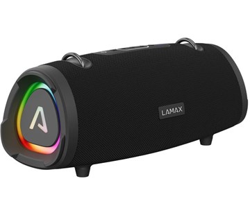 Přenosný reproduktor LAMAX Eclipse1, výkon 60 W, dvoupásmové reproduktory, baterie až 9,5 hodiny, Bluetooth 5.3, automatické párování, až 5 nastavitelných LED efektů, FM rádio, podpora různých formátů a připojení, IPX6, USB-C, popruh přes rameno.