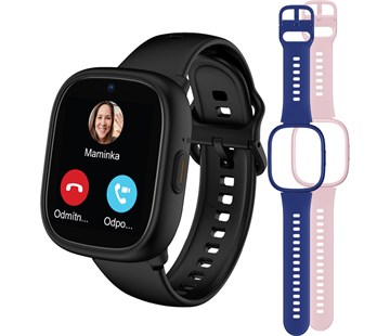 chytré hodinky pro děti • 1,7" barevný dotykový displej (rozliišení 280 × 240 px) • určování polohy PinPoint (GPS, LBS, A-GPS, Wi-Fi, akcelerometr) • nano SIM slot s podporou 4G/LTE (v balení SIM karta T-Mobile 200 MB) • videohovory • měření tepu a okysličení krve • funkce FriendConnect (propojení až 60 kamarádů) • funkce FamilyCareConnect (propojení rodinných příslušníků) • monitor denní aktivity • SOS tlačítko • výdrž až 5 dní • odolnost vůči prachu a vodě IP67 • barva černá (+ v balení 2 extra kryty a 2 řemínky – růžové a modré)