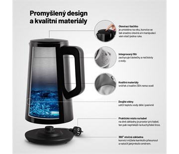 Jednou ze zásadních vlastností této konvice je možnost nastavení různých teplot. Na dotykovém LED displeji lze jednoduše zvolit požadovanou teplotu mezi 40 °C až 100 °C, což je ideální pro přípravu různých druhů čajů, které vyžadují specifické teploty vody. K dispozici je také funkce udržování teploty Keep Warm, která zaručí, že voda zůstane horká až po dobu dvou hodin, a díky dvojité stěně ani potom rychle nevychladne. Další praktickou funkcí je 360° otočná základna, která usnadňuje manipulaci a umožňuje pohodlné umístění konvice v jakémkoli směru. Integrovaný filtr zachycuje nečistoty a napomáhá udržovat konvici v čistotě, čímž prodlužuje její životnost. Bezpečnost při používání je zajištěna několika prvky. Konvice je vybavena ochranou proti přehřátí a automatickým vypnutím při dosažení bodu varu nebo při nedostatku vody. |
