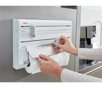 praktický zásobník na balící folie, papírové utěrky, alobal či sáčky na potraviny, vyrobený z vysoce kvalitního plastu v originálním designu, snadné a rychlé oddělení požadované délky, záruka 3 roky