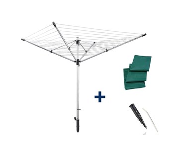 Součástí sušáku je i ukotvovací držák, který lze snadno zavrtat přímo do půdy bez nutnosti betonování. K příslušenství patří rovněž ochranný obal. Na každém ramenu sušáku je navíc ještě háček umožňující sušení košile či šatů přímo na ramínku, aniž by hrozilo, že ve větru spadne. Díky tažnému lanku se sušák rozkládá jednoduše a rychle. Hliníková konstrukce je odolná vůči povětrnostním vlivům. Nekoroduje ani nepodléhá UV záření. |