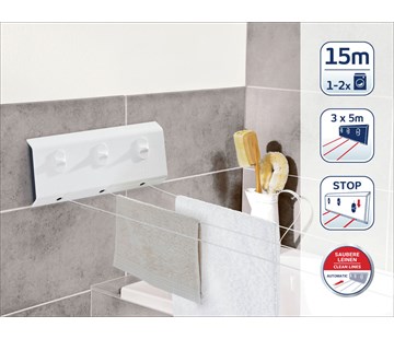 praktický skládací nástěnný sušák na prádlo, šetří místo, lze vysunout do do libovolné šířky, délka sušící plochy až 15 m, kapacita prádla na 1-2 pračky prádla, umyvatelný, dodávaný spolu s doplňky k zavěšení
