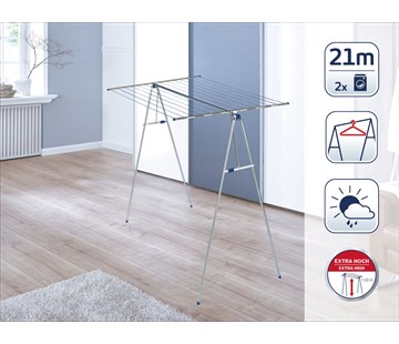 sušák na prádlo pro venkovní i vnitřní použití, délka sušicí plochy 21 m, rozměr sušáku 150 x 150 x 100 cm, vhodný i pro delší kusy prádla, výška sušáku 150 cm, vyroben z nerezavějících materiálů, záruka 2 roky