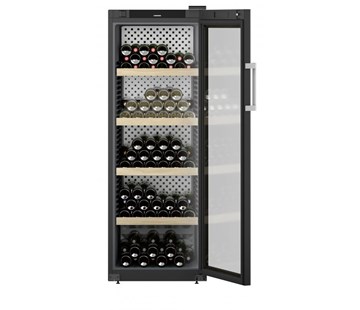 en. třída F; Vinotéka klimatizovaná, objem 389l, max.počet lahví Bordeaux 0,75l- 196 ks, materiál polic: bukové dřevo, počet úložných ploch 5, TempProtectPlus, Humidity Control, VibrateSafe, Presentation Light, integrovaný SmartDevice, 1-zónová, Rozsah teplotních zón: +5 až +20°C, Dveře: Izolační sklo, UV Protect Plus , zámek, Černá