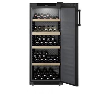 en. třída E; Vinotéka klimatizovaná, objem 322,8 l, FreshAir filtr, max.počet lahví Bordeaux 0,75l- 166 ks, materiál polic: bukové dřevo, počet úložných ploch 5, TempProtectPlus, Humidity Select, SmartDevice ready, 1-zónová, Rozsah teplotních zón: +5 až +20°C, Plné dveře, Černá, Digitální ukazatel teploty, LED osvětlení