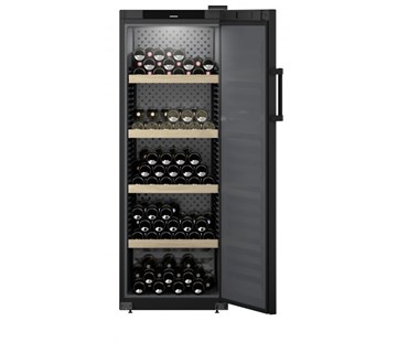 en. třída E; Vinotéka klimatizovaná, objem 378,1 l, FreshAir filtr, max.počet lahví Bordeaux 0,75l- 196 ks, materiál polic: bukové dřevo, počet úložných ploch 5, TempProtectPlus, Humidity Select, SmartDevice ready, 1-zónová, Rozsah teplotních zón: +5 až +20°C, Plné dveře, Černá.Monochromatický LC displej ve dveřích,dotyková elektronika, LED osvětlení