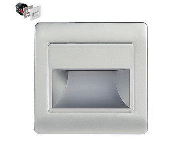 Schodišťové hranaté LED svítidlo Step Light pro orientační nasvícení interiéru s krytí IP20 je zhotoveno z odolného plastu v matně stříbrné barvě. Svit zajišťuje integrovaný LED čip o příkonu 1 x 1,5 W se svítivostí 120 lm a teplotou chromatičnosti 4000 K.