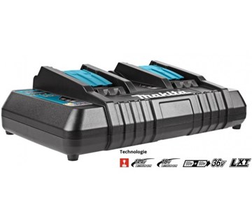 dvojnabíječka Makita pro akumulátory LXT 14,4-18V; články lze nabíjet buť jednotlivě nebo každý zvlášť.; kapacita akumulátoru od 1,5Ah a dobou nabíjení 15 min. až po 6Ah a dobou nabíjení 55min; vhodná zejména pro stroje 2x18V kde dva kumulátory používáte a může další dva akumlátory rovnou nabíjet. rych