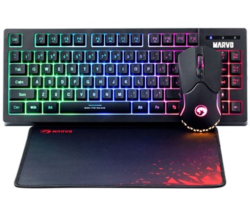 RGB sada klávesnice,myši,podložky,US,herní,membránová,drátUSB),černá;Multimediální klávesnice;multibarev.podsvícení;anti-ghosting pro 25 kláves;Optická myš;DPI:800/1200/2400/3200;7 tlačítek:(programovatelných);Podložka pro vysoce citlivé myši;Design proti pocení;Rozměry:28x23x0,2cm;Pogum.spodní část