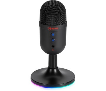 | Jedním z výrazných prvků je také kovový stojan, který poskytuje pevnou a stabilní podporu mikrofonu. To nejenže zlepšuje jeho celkový vzhled, ale zároveň minimalizuje přenos vibrací a nežádoucích zvuků z okolí. Další výhodou je bezesporu protiskluzová gumová podložka ze spodní strany, čímž nebude docházet k nechtěnému posunu mikrofonu po stole. Těšit se můžete také na RGB podsvícení, které dodá vašemu mikrofonu neobyčejný vzhled. Nechybí ani důležitý konektor pro sluchátka. Určitě oceníte tlačítko MUTE, kterým můžete kdykoliv mikrofon jednoduše vypnout. |  |
