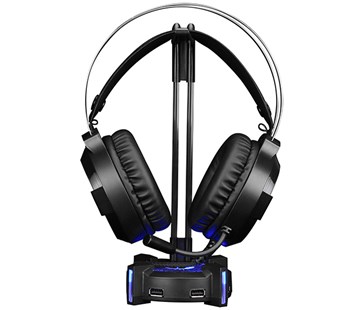 Stojan na sluchátka s USB hubem - 4 porty USB 3.0(výstup); IC: GL3510+EM103; Provozní napětí: 5V; Provozní proud: ? 200 Ma; Podsvícení: RGB; Délka kabelu: 1 m; Rozměry: 255 x 95 x 95 mm