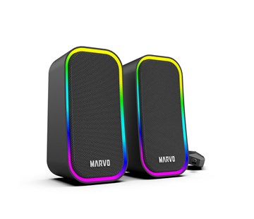 reproduktory; 2.0,stereo;výkon: 2 x 3 W; frekvenční rozsah: 150 Hz - 20.000 Hz;velikost měniče: 2"; impedance: 2 x 4 Ohm;podsvícení RGB Rainbow(možnost vypnutí)- 5 různých světelných režimů; rozhraní: 3.5 mm jack, USB (napájení); napájení: USB, DC 5V = 0.2A; citlivost: 650 mV ± 50mV; materiál: plast