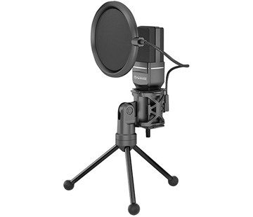 stream.mikrofon,bez regulace hlasitosti,černý,s 270° otočným tripodem;Pop filtr(O10 cm);Pěnová větrná ochrana;IC:CM6327A;Zabudovaná zvuk.karta;Frekvenční rozsah:20 Hz-20KHz;Impedance: ? 2200?; typ:všesměrový;Velikost:9x5mm;Citlivost:-47dB±3dB;Připojení:USB;Délka kabelu:1.5m;Rozměry:150x38x45mm