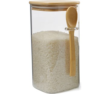 Objem 1200 ml; Rozměry: 21 x 10 x 12 cm (výška x šířka x hloubka) - včetně víčka a ucha; Elegantní organický vzhled; Dokonalé utěsnění potravin, díky integrovanému silikonovému těsnění; Přírodní bambusové víčko; Přírodní bambusová lžička; Praktické ucho pro uložení lžičky; Kvalitní borosilikátové s