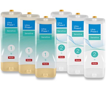 Miele UltraPhase 1a 2 Sensitive Zásoba pracích prostředků Miele Sensitive na půl roku, součástí je 3x UltraPhase 1 a 3x UltraPhase 2 , Bez vonných látek a barviv – obzvláště snášenlivý s pokožkou, koncentrovaný – z lásky k přírodě: až pro 189 pracích cyklů , Pro všechny