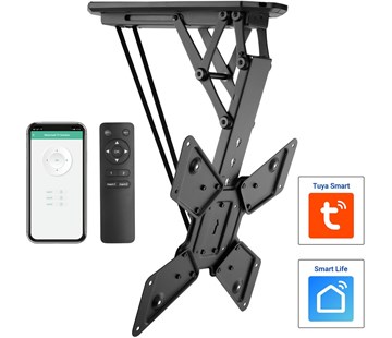 SMART sklopný motorizovaný držák na TV do 55", Dálkové ovládání RF, Možnost ovládání přes aplikaci v mobilním telefonu, kompatibilní aplikace TUYA pro Android i iPhone, Nosnost 30 kg, VESA max. 400x400 mm. Použití pro montáž do stropu nebo šikmého stropu. Možnost spárovat až 20 dálkových ovladačů.