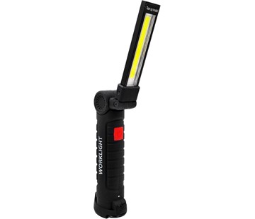 Aku LED svítidlo, COB LED, 2 stupně intenzity bílého světla, přední bílá bodová LED, červené světlo s režimem trvalé svícení / blikání, magnetická koncovka, závěsný háček, Li-Ion nabíjecí baterie 2000 mAh, životnost baterie 500 cyklů, svítivost až 300 lm, výklopná hlava o 360°, měkký povrch