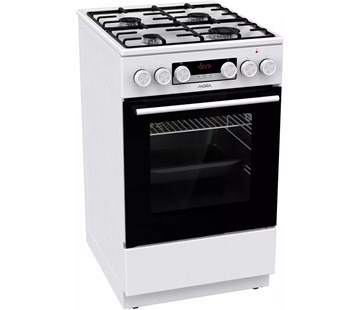 kombinovaný sporák • energetická třída A • 4 plynové hořáky s pojistkami STOP GAS (vlevo vpředu O 5,4 cm, 1 kW; vpravo vpředu O 9,9 cm, 3 kW; vlevo vzadu O 7,4 cm, 1,9 kW; vpravo vzadu O 7,4 cm, 1,9 kW) • objem multifunkční trouby 62 l • 8 druhů ohřevu • smaltovaná dvoudílná mřížka STABIL PLUS • integrované zapalování hořáků • digitální dotykový časový spínač s hodinami • možnost programování doby pečení • program PIZZA • program HOTOVÁ A MRAŽENÁ JÍDLA • ECO CLEAN (funkce na čištění trouby) • regulace teploty v troubě v rozmezí 50–275 °C • osvětlení trouby • chladná dvířka • úložný prostor • jmenovitý příkon 3,2 kW • elektrické napětí 230 V • rozměry 85 × 50 × 59,4 cm • barva bílá • příslušenství: rošt, XXL hluboký pekáč