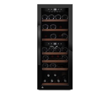 vinotéka • pro 38 lahví • 2 teplotní zóny • hlučnost 38 dB • energetická třída E • sklo s UV ochranou • dřevěné police • Winter Safe System • zámek • digitální nastavení teploty • displej • 39,5×104×63 cm