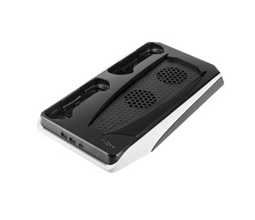 multifunkční stanice pro PlayStation 5 • nabíjecí doky až 2 ovladače současně • integrované chladící ventilátory pro aktivní chlazení konzole • 2 x USB port pro připojení dalšího příslušenství • dotykové ovládání chlazení • efektivní modré podsvícení při chlazení • výsuvný pořadač až pro 12 her • nástavec pro připojení digitální verze