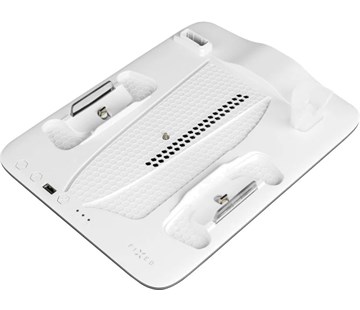 Dokovací stanice FIXED v jedinečném designu je praktickým doplňkem pro vaši konzoli PlayStation 5 (Slim) 2023, a to v digitální i diskové verzi. Dokovací kolébky stanice umožňují nabíjet dva ovladače DualSense současně pomocí odnímatelných USB-C adaptérů. Po každém hraní stačí ovladače jednoduše zacvaknout a budou vždy připravené k použití. Ventilační systém odvádí během hraní teplo z konzole, mezi třemi stupni intenzity lze volit pomocí stisku tlačítka. Stanice je navíc vybavena držákem pro pět diskových her, odnímatelným stojánkem na sluchátka a držákem na PS5 Media Remote. Po obvodu celé stanice je LED osvětlení s možností volby barev, což činí dokovací stanici nejen praktickým, ale také designovým prvkem. Konzole je se stanicí propojena v zadní části pomocí přiloženého dvojitého USB-A/USB-C kabelu. Protiskluzové silikonové podložky zajišťují stabilitu a bezpečnostní prvky ochranu proti přepětí, podpětí a zkratu. Konzoli ke stanici připevníte pomocí šroubu. Mějte veškeré PS5 příslušenství přehledně uspořádané na jedné stanici pro absolutní komfort během hraní.