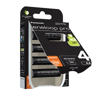 4 kusy baterie.Jedná se o speciální NiMH nabíjecí baterie s extrémně nízkým samovybíjením.NiMH baterie PANASONIC - ENELOOP PRO. Díky speciální technologii udrží tyto baterie po dobu jednoho roku 85% s