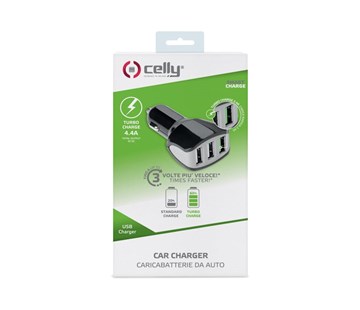 Kvalitní stylová autonabíječka CELLY se 3 USB porty. Dva z USB portů mají klasický výstup 1A, třetí zeleně označený dokáže díky výstupu 2,4A s rychlonabíjením doplnit energii mnohlem rychleji, než běžné nabíječky.