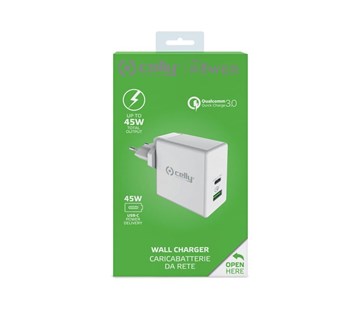 Kvalitní a výkonná síťová nabíječka CELLY nabízí USB port s podporou rychlého nabíjení Qualcomm Quick Charge 3.0 (max 18W) a USB-C port s Power Delivery technologií (max 45W), dokáže tak nabíjet i dvě zařízení současně.