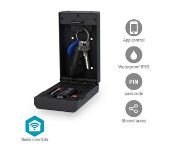 bluetooth uzamykatelná schránka; nástěnné nebo třmenové řešení pro kliku dveří; dostatečně velká pro uložení klíčů, přístupových karet, kreditních karet a dalších cenností; ideální pro každodenní domácí použití s rodinnými příslušníky nebo pro obchodní využití (pronájem domu, garáže).