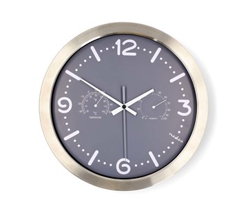 Vybaveno teploměrem a vlhkoměrem: Přesně zobrazuje vnitřní teplotu a úroveň vlhkosti;Přehledný displej: Šedý ciferník s bílými indexy (číslicemi, pruhy a body) pro lepší čitelnost;Prémiové materiály: Odolný rám z nerezové oceli s moderní povrchovou úpravou;Provoz na baterie: Vyžaduje 1x baterii AA
