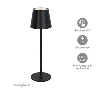 Led stolní lampa; s plynule stmívatelným dotykovým ovládáním (teplá, přirozená a studená bílá); s integrovaným nabíjecím portem USB-C; s krytím IP44 pro venkovní použití; maximální doba svícení až 40 hodin; délka napájecího kabelu 1m; 150 lm; barevná teplota 3000 - 6000 K.